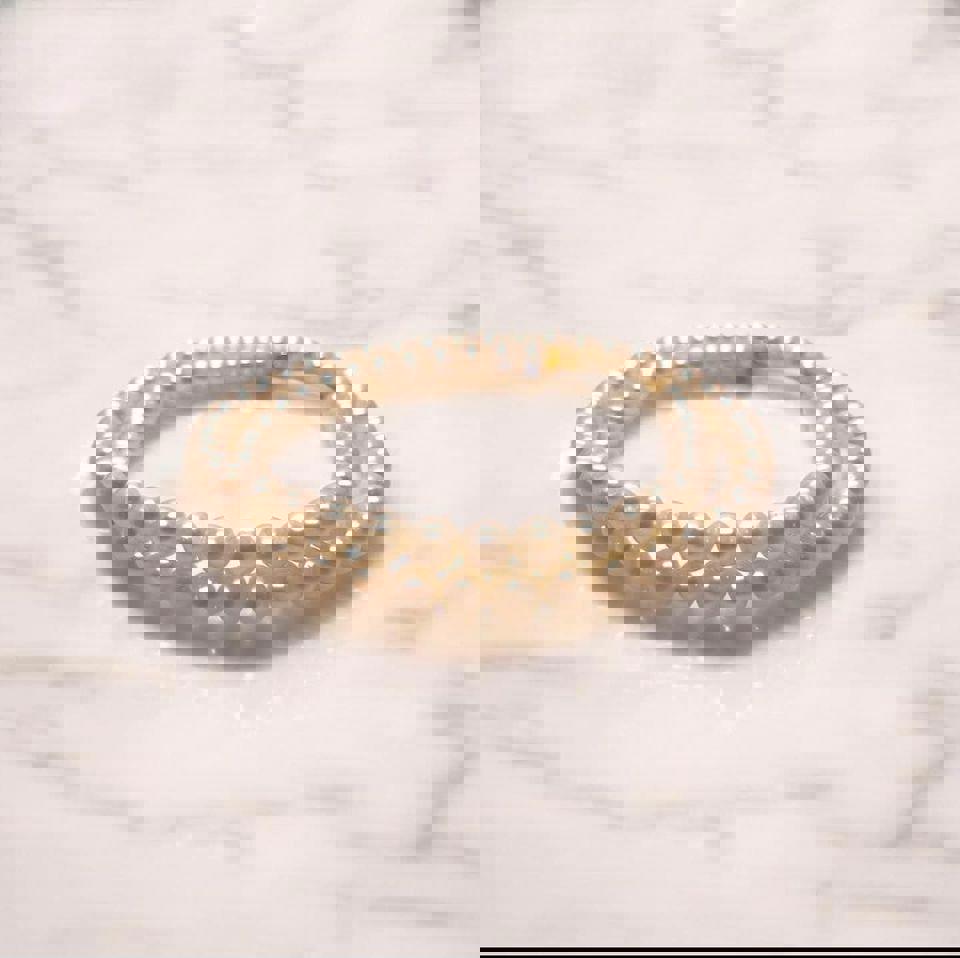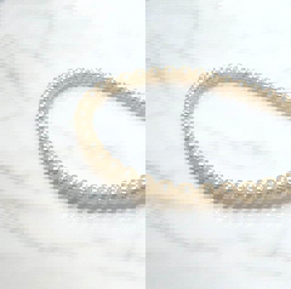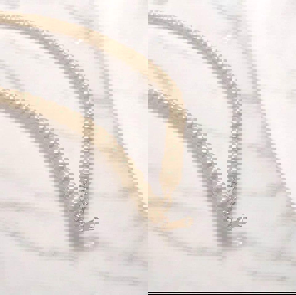 This exquisite glamour single strand pearl necklace with high lustre 5mm nucleus-free AAA freshwater pearl, showing cream body with an clasp in 18K gold.