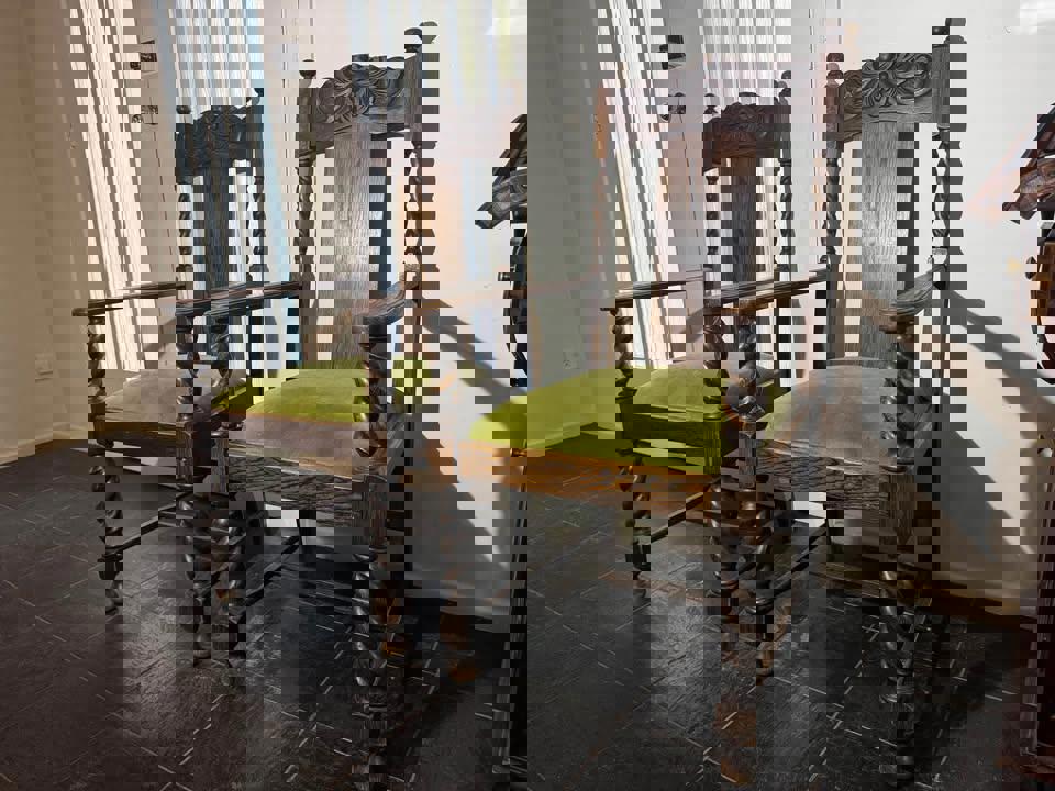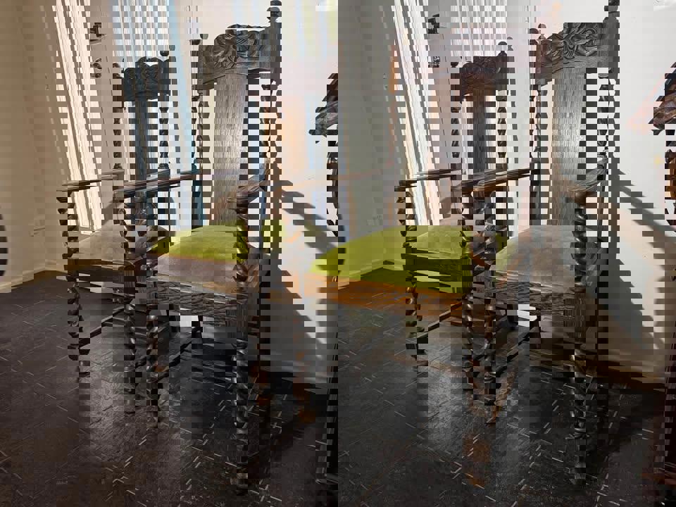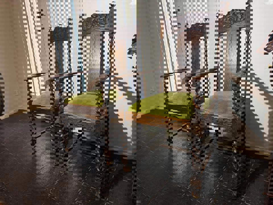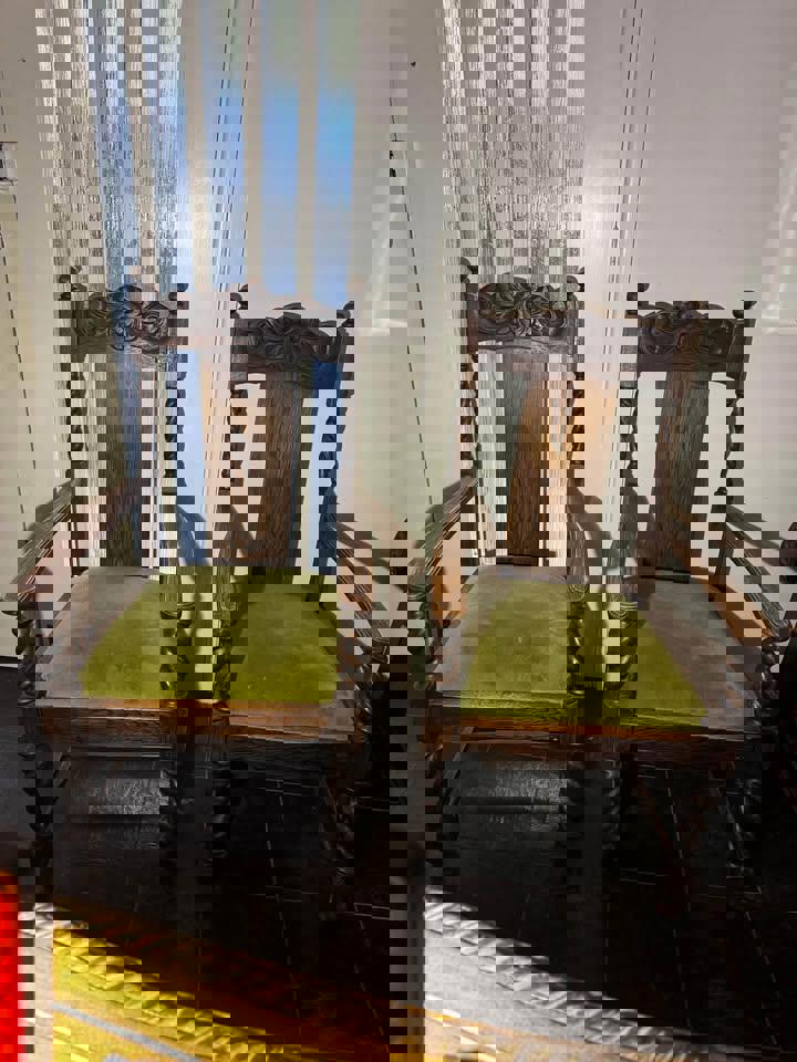 A pair of Antique solid timber chair excellent condition green velvet . Strong and firm. Nice timber. Pick up from Templestowe