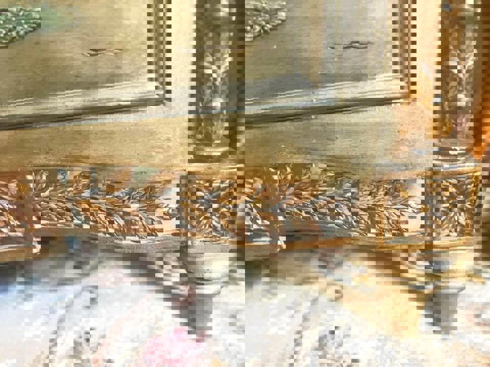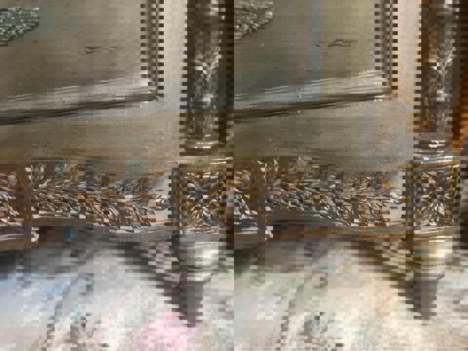This beautiful antique chest of drawers brings elegance and sophistication to any space. Crafted with a deep gold grey finish, the piece features intricate hand-carved details along the front and sides, showcasing classic vintage charm. The chest is designed with three spacious drawers, each adorned with ornate metal handles, perfect for adding a touch of character to your bedroom, living room, or hallway.