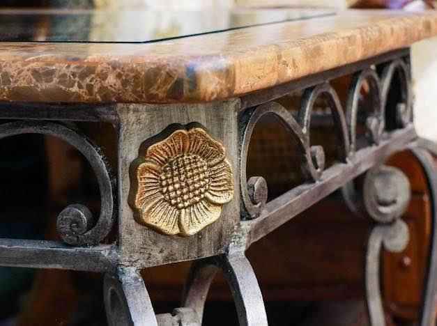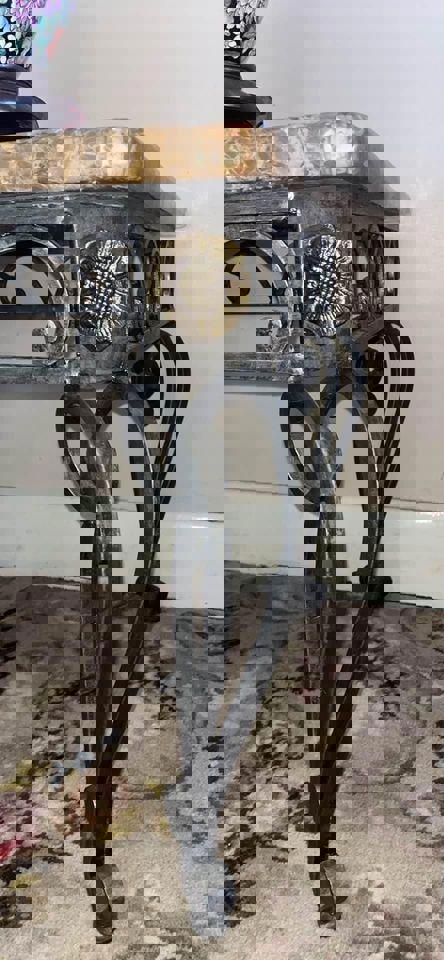 - Durable metal table base with intricate scrollwork and a marble surface.