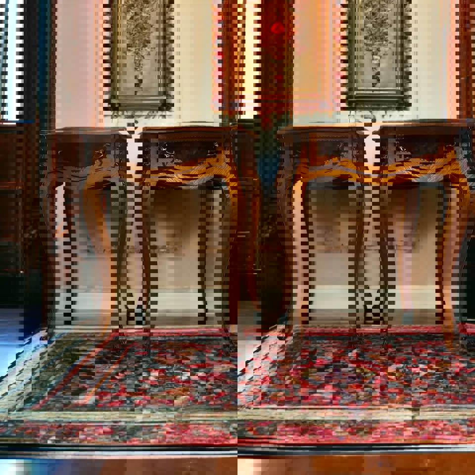 Discover the charm of these exquisite vintage side tables, perfect for enhancing your living space. Crafted with intricate detailing, these tables feature beautiful brass accents and sturdy wood construction, making them both stylish and durable. Ideal for placing beside a sofa or bed: