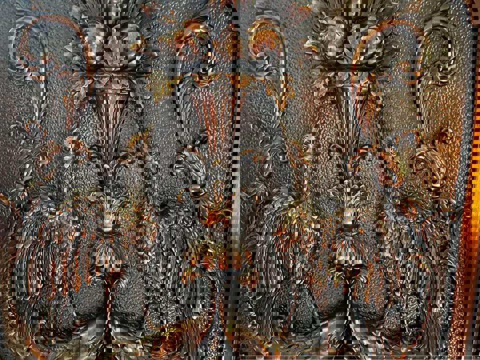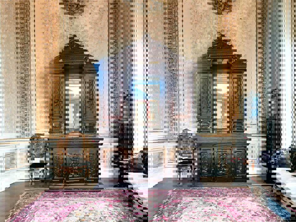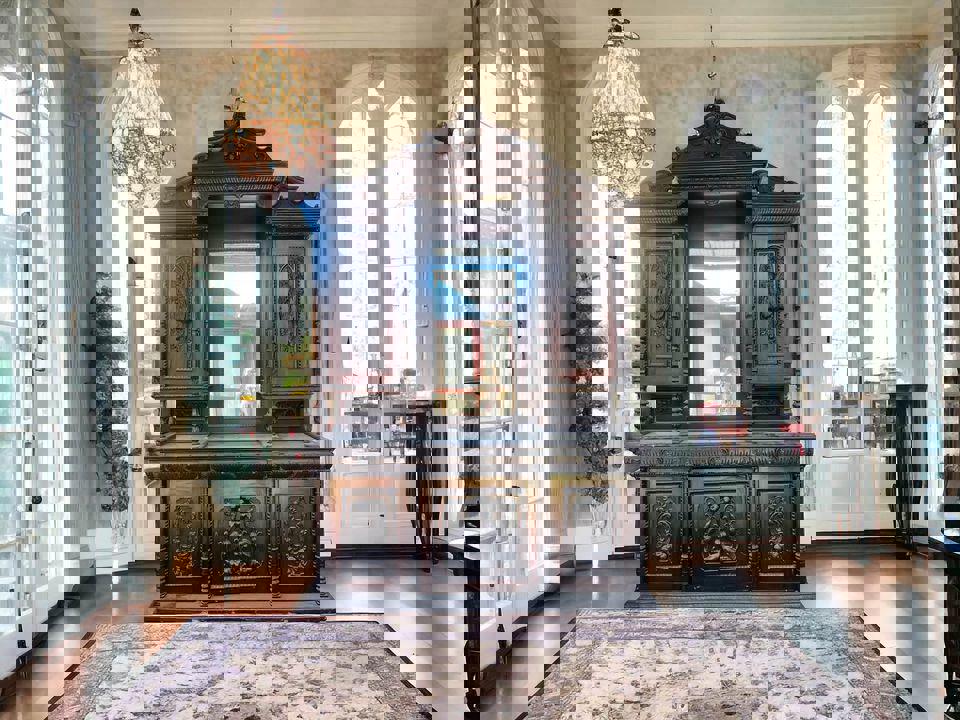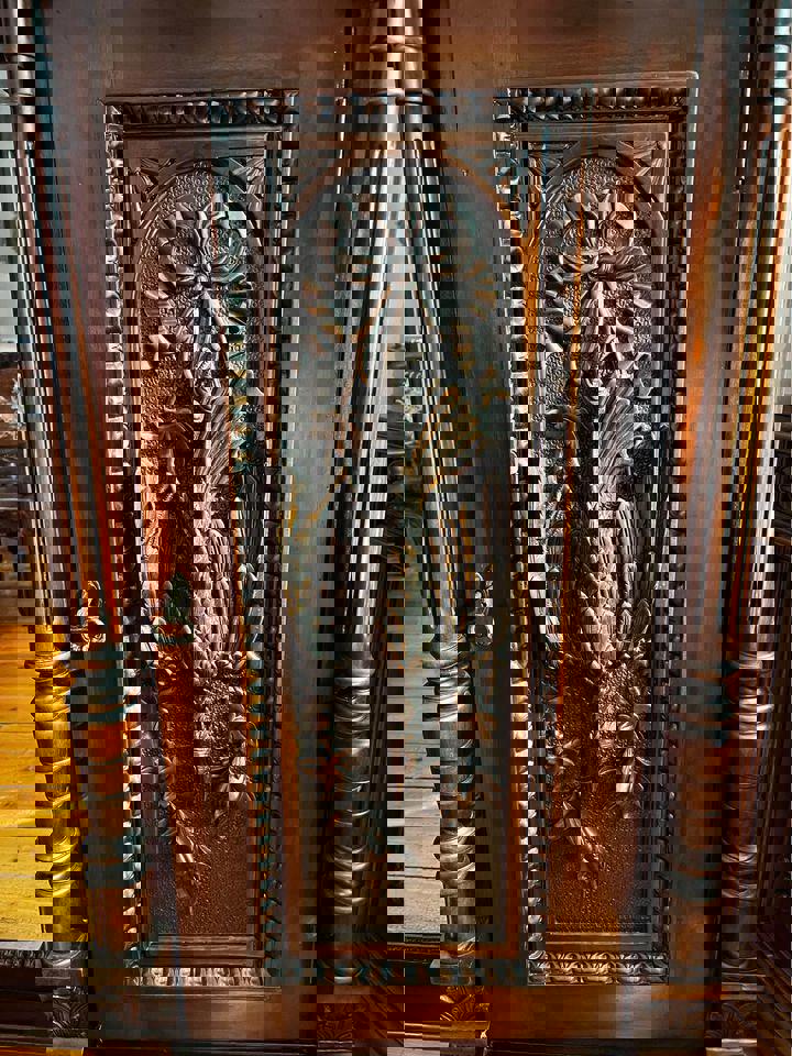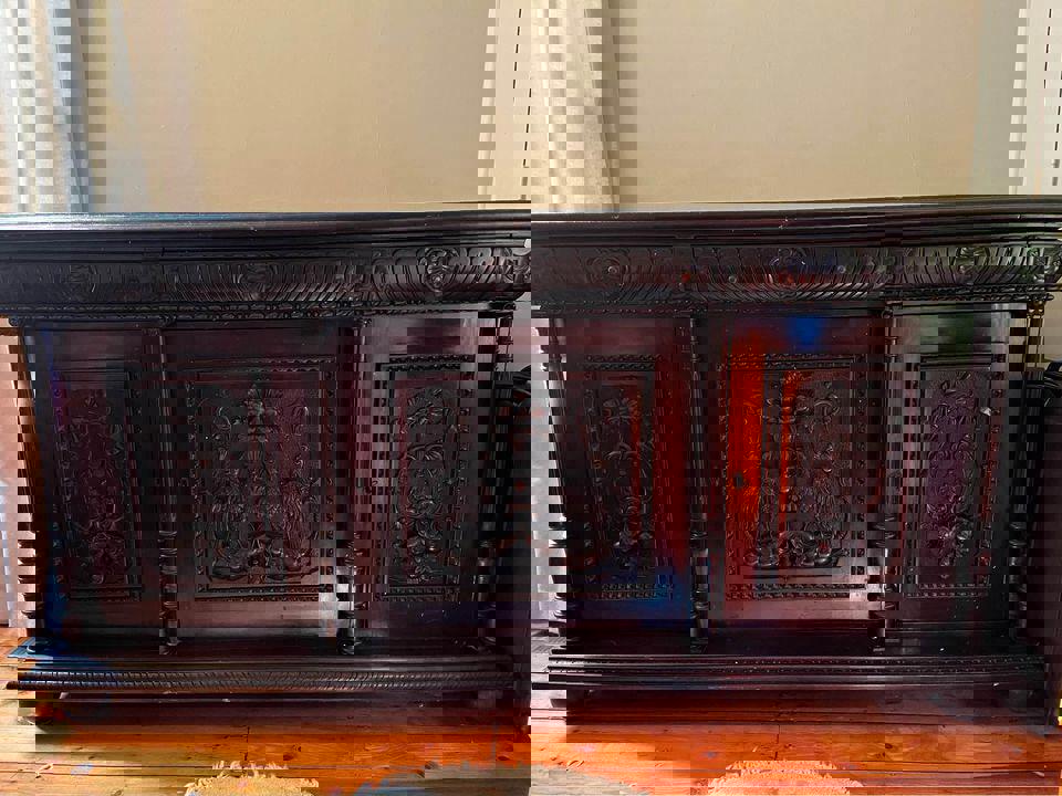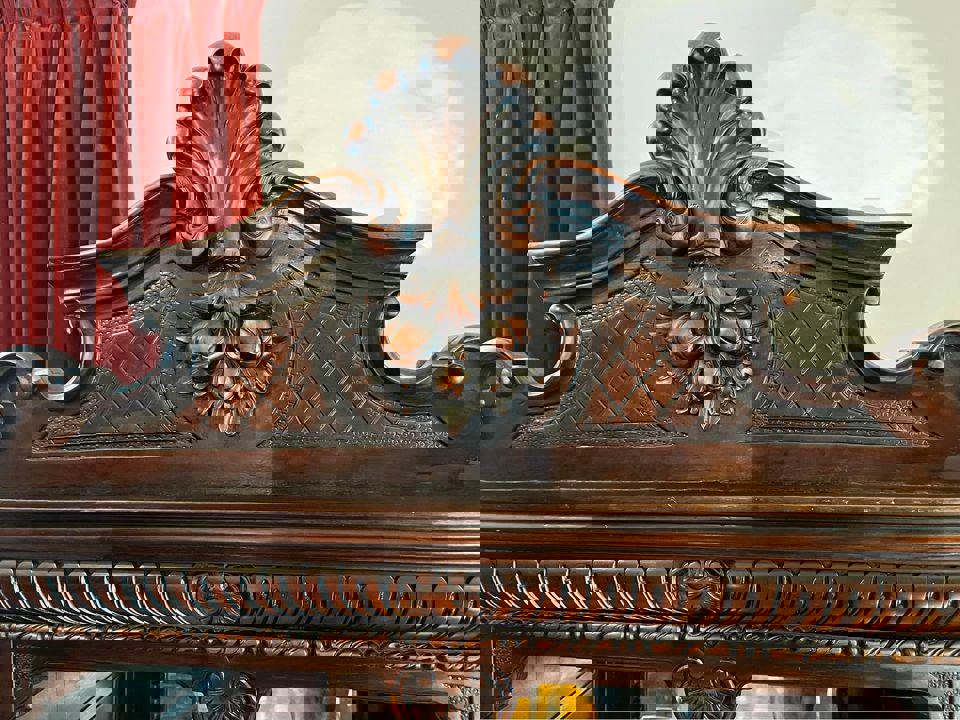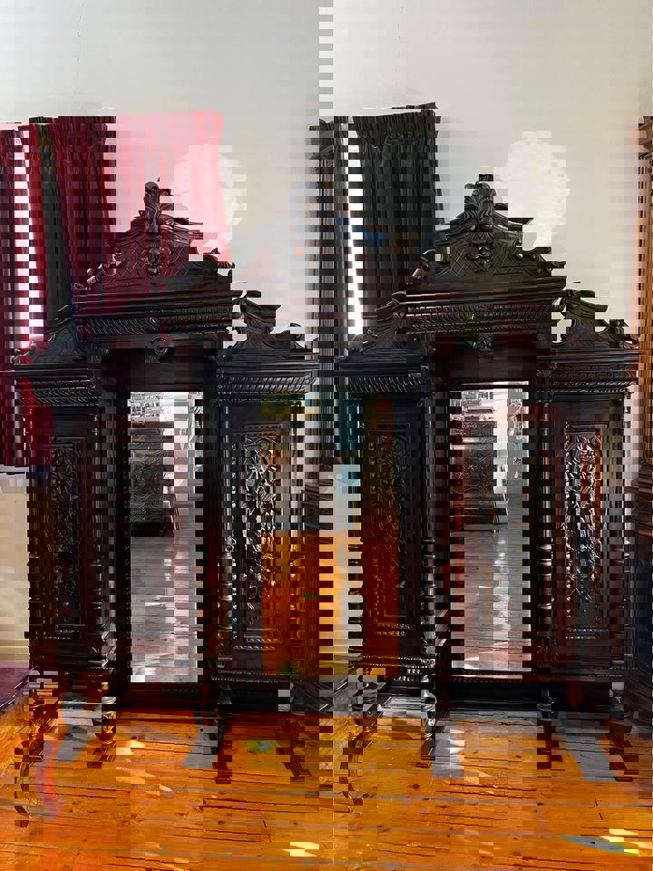 Impressive very large antique wall unit display cabinet mahogany 330x200x60cm hand carved