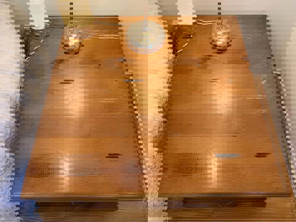 Large thick rustic wooden coffee table tv unit sideboard and a pair matching corner tables