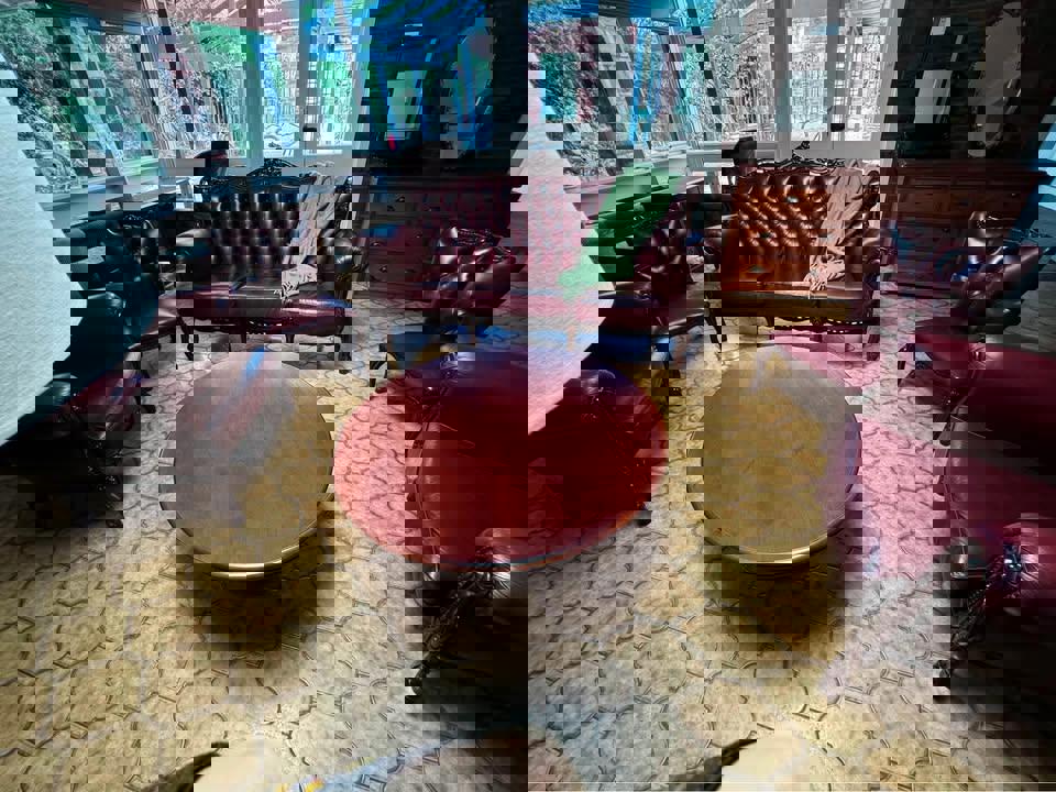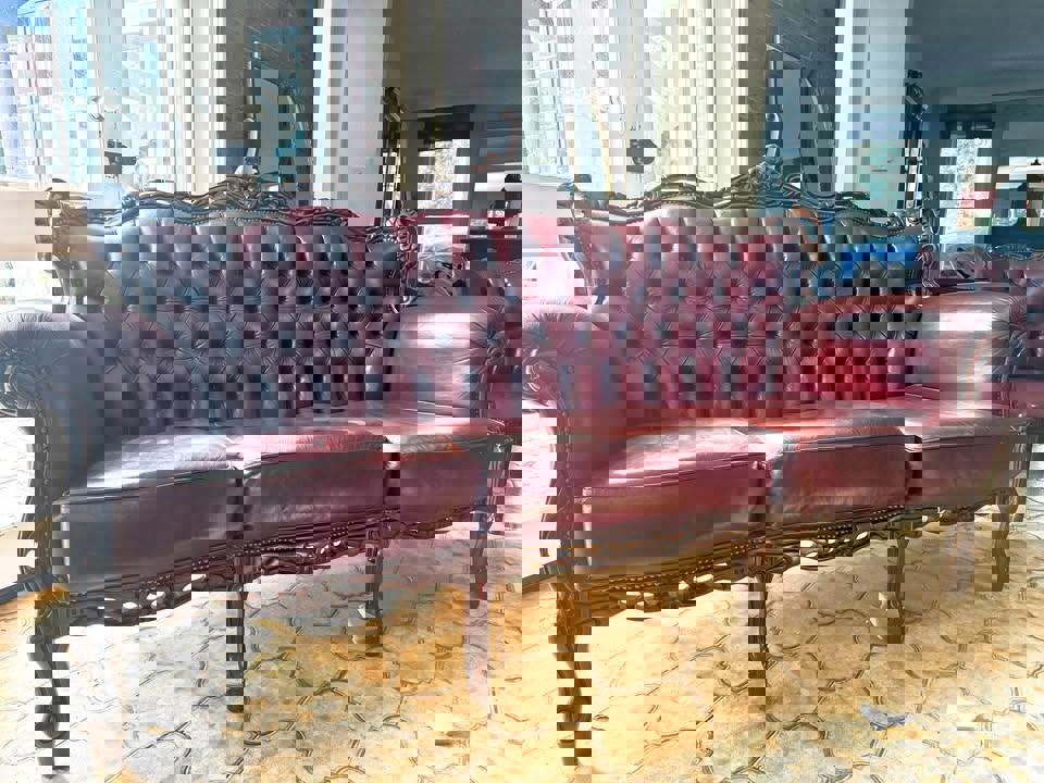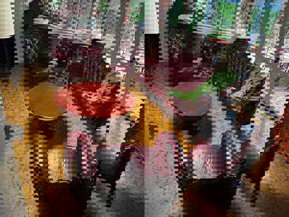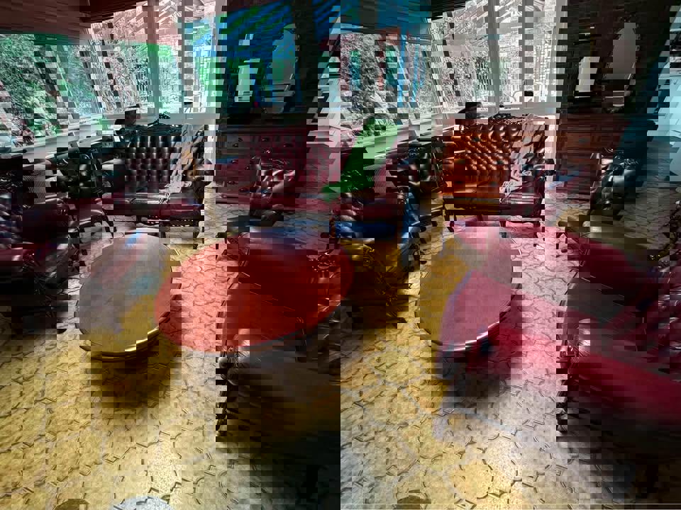Elevate your living space with this exquisite vintage leather lounge suite, perfect for adding a touch of elegance to any room. Featuring rich burgundy tones and intricate detailing, this suite includes a spacious sofa and four comfortable armchairs, all upholstered in high-quality leather. The suite is completed with a stylish round wooden coffee table, enhancing its classic appeal. Ideal for both relaxation and entertaining guests. - Vintage charm with modern comfort - Durable leather upholstery - Includes sofa and four armchairs - Complementary wooden coffee table - Perfect for any living area